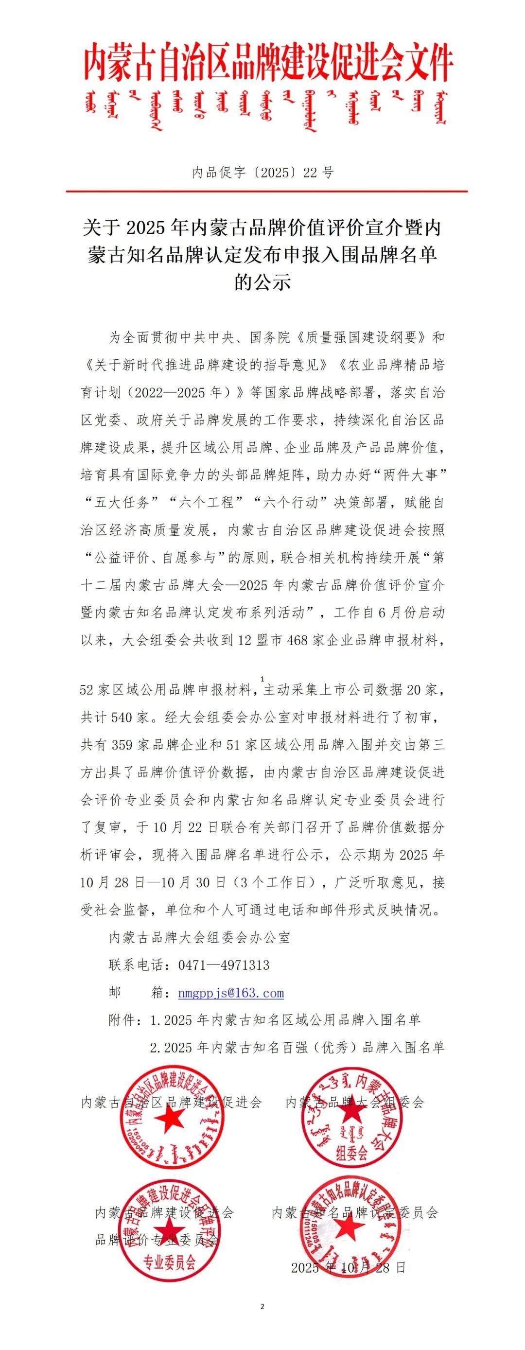 关于2025年内蒙古品牌价值评价宣介暨内蒙古知名品牌认定发布申报入围品牌名单的公示
